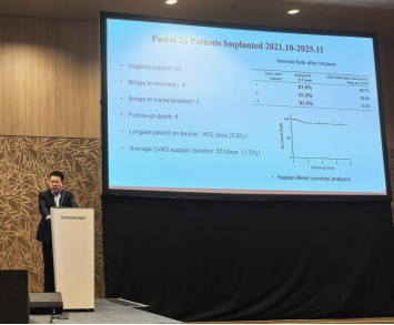 本次年會期間,中國國家心血管中心中國醫學院阜外醫院陳海波教授在其《LVAD Therapy in China: Past, Present,and Future》學術報告中,向全球專家分享了一組阜外醫院的數據:即2021年10月至2025年11月期間,76例植入Corheart?6心衰患者的生存率數據及相關情況。
