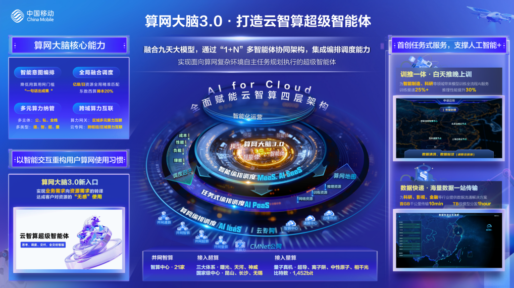2021 年,中國移動率先提出“算力網(wǎng)絡(luò)”全新理念,自主研發(fā)“算網(wǎng)大腦”作為算力網(wǎng)絡(luò)的智能中樞。如今,隨著“東數(shù)西算”國家工程深入推進(jìn)和AI 技術(shù)爆發(fā)式增長催生海量算力需求,中國移動算網(wǎng)大腦構(gòu)建起“廣納管、精調(diào)度、新服務(wù)”三位一體的技術(shù)體系,成功實(shí)現(xiàn)“以網(wǎng)強(qiáng)算、算網(wǎng)融合”的核心目標(biāo)。